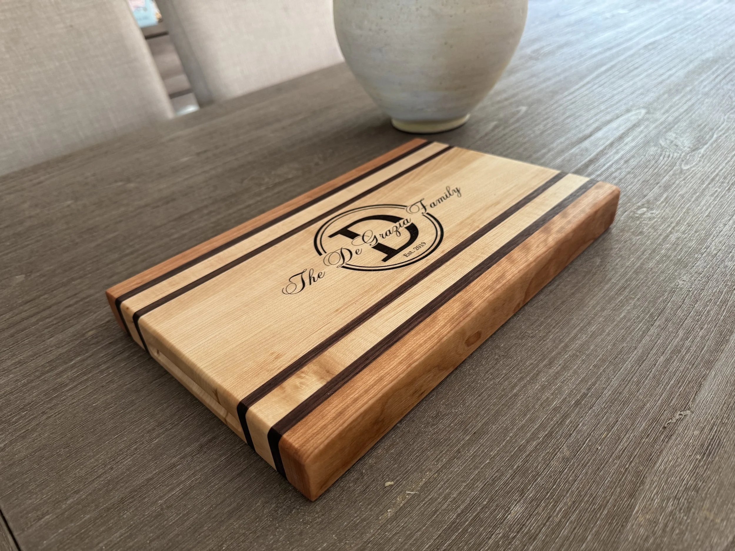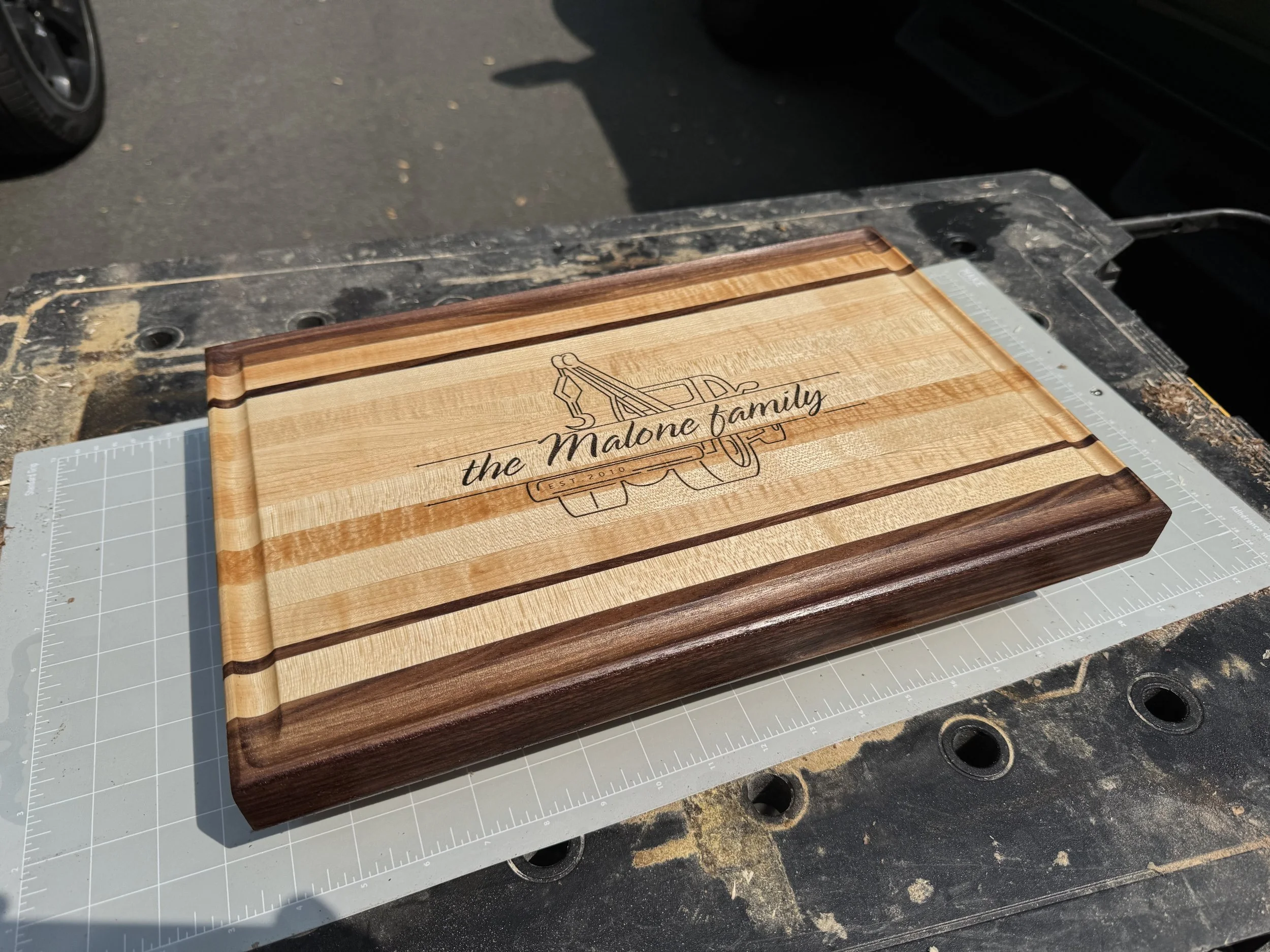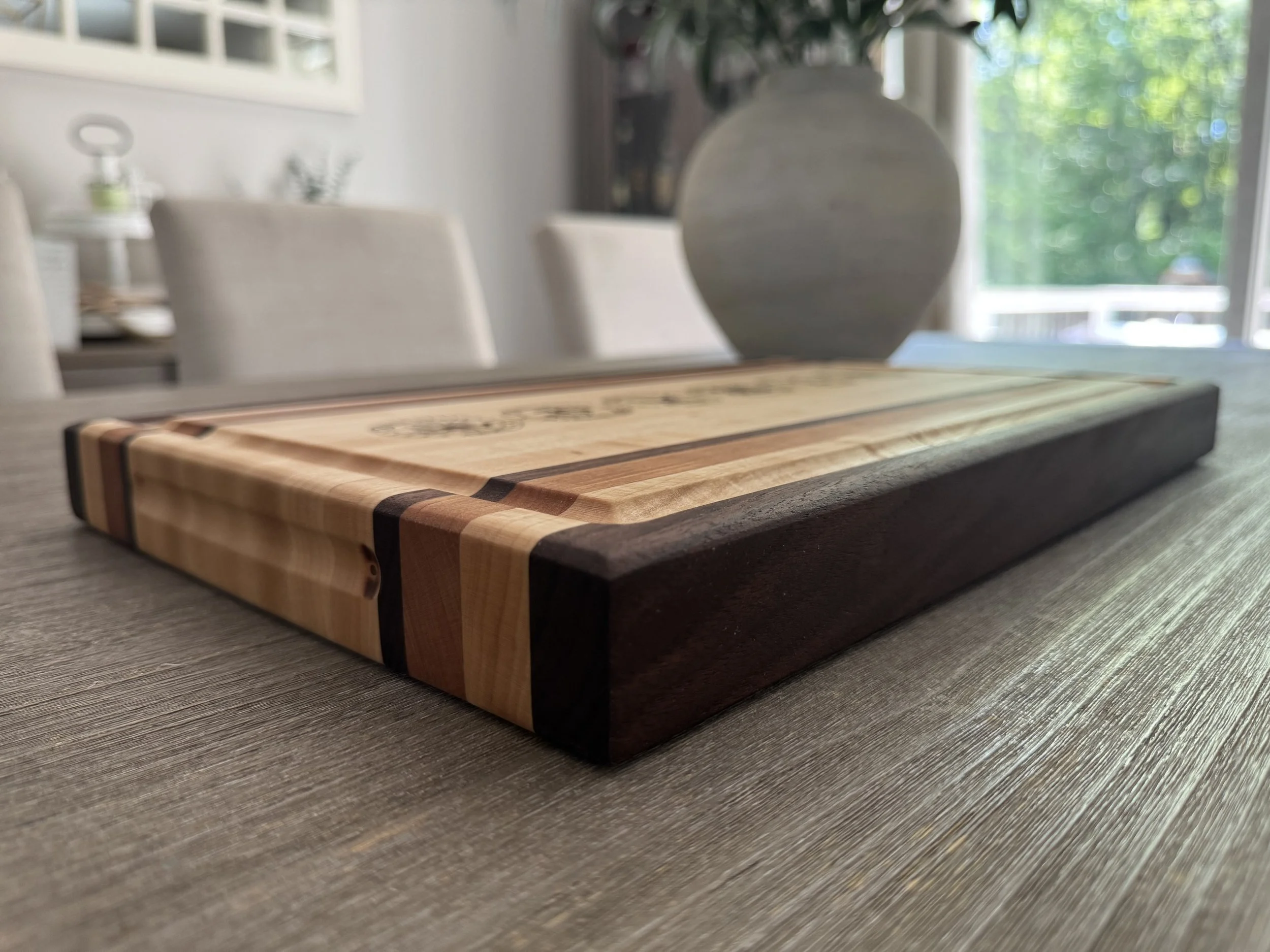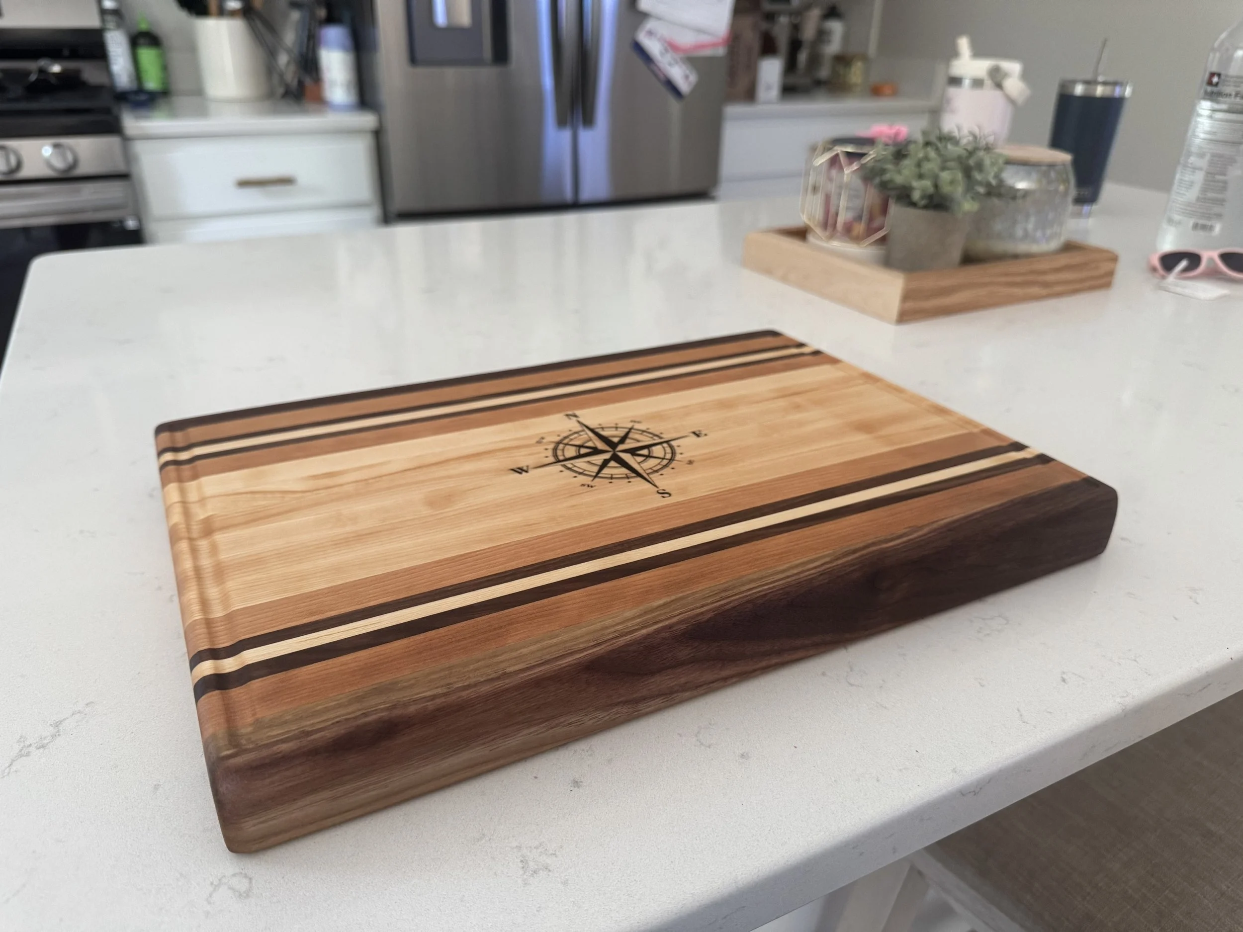 Compass Cutting Board Custom maple and walnut cutting board 55 Year old butcher block island restoration Custom maple, walnut and cherry cutting board Coffee Table Cherry Serving Board Custom walnut server / cutting board with detachable legs Custom cutting board